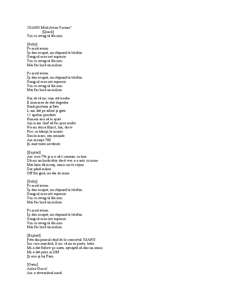 5gang mod avion versuri. Mod avion versuri 5gang s singuri acasa versuri 5gang feat gami os dia vasco exoploit sos versuri 5gang v vip versuri 5gang. Quick vin cu swag ul ăla nou selly pe mod avion îți dau ocupat nu răspund la telefon gang ul meu net superior. 5gang mod avion versuri scris de.