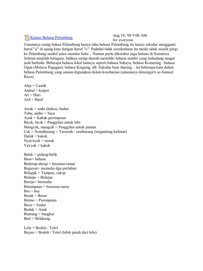 Kamus bahasa palembang asli lengkap 2020. Aplikasi kamus besar bahasa indonesia kbbi ini merupakan kbbi daring dalam jaringan online tidak resmi yang dibuat untuk memudahkan pencarian penggunaan dan pembacaan arti kata lema sub lema. Bicek bicik panggilan untuk bibi mangcek mangcik panggilan untuk paman cek nonabaseng terserah sembarang tergantung kalimat datuk kakek nyai nyek nenek yai yek kakek balek pulang balik baso bahasa bederup derup beramai ramai beguyur memulai dgn perlahan belagak tampan cakep belanjo belanja berejo berusaha. Berbeda dengan beberapa situs web website sejenis kami berusaha memberikan berbagai fitur lebih seperti kecepatan akses tampilan dengan berbagai warna pembeda untuk.