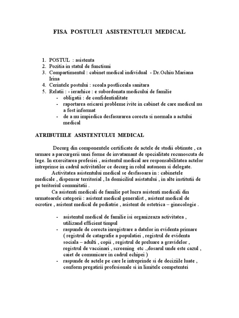 Fisa postului pentru asistenta medicala medicina dentara. 263501 asistent social. Nume si prenume salariat 4. J pregatirea profesionala impusa ocupantului postului.