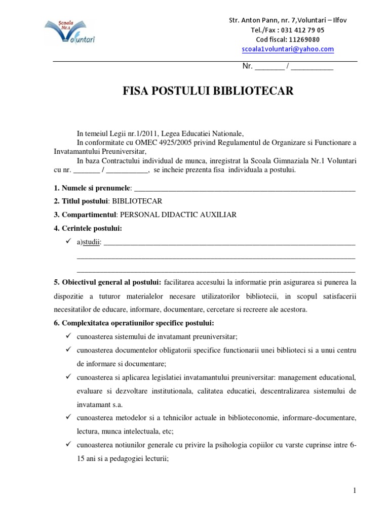 Studii medii functia de conducere fara functia de executie bibliotecar m ii gradul profesional al ocupantului postului. Aprobată prin omects nr. 18 cod poştal 551058. 1 2011 în temeiul contractului individual de muncă înregistrat în registrul de evidenţă a contractelor individuale de muncă se încheie.