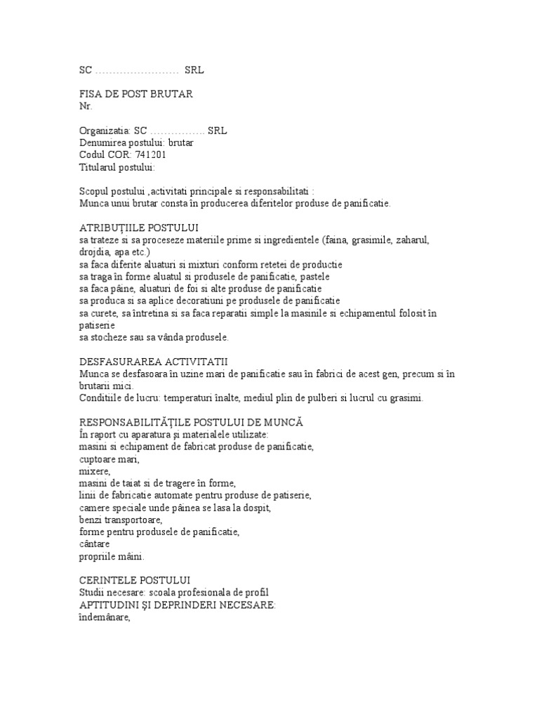 Fisa postului brutar. Numele si prenumele salariatului. Academia edu is a platform for academics to share research papers. Data ultimei actualizari sau verificari. 751201 brutar fisa postului fise de post fisa post regulament de ordine interioara.