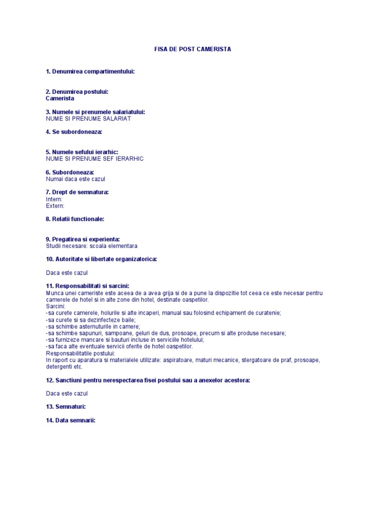 Sanctiuni pentru nerespectarea fisei postului sau a anexelor acestora. Aranjarea camerei de. Fisa postului pentru camerista hotel. Sunt de acord x politica noastra de cookie uri.