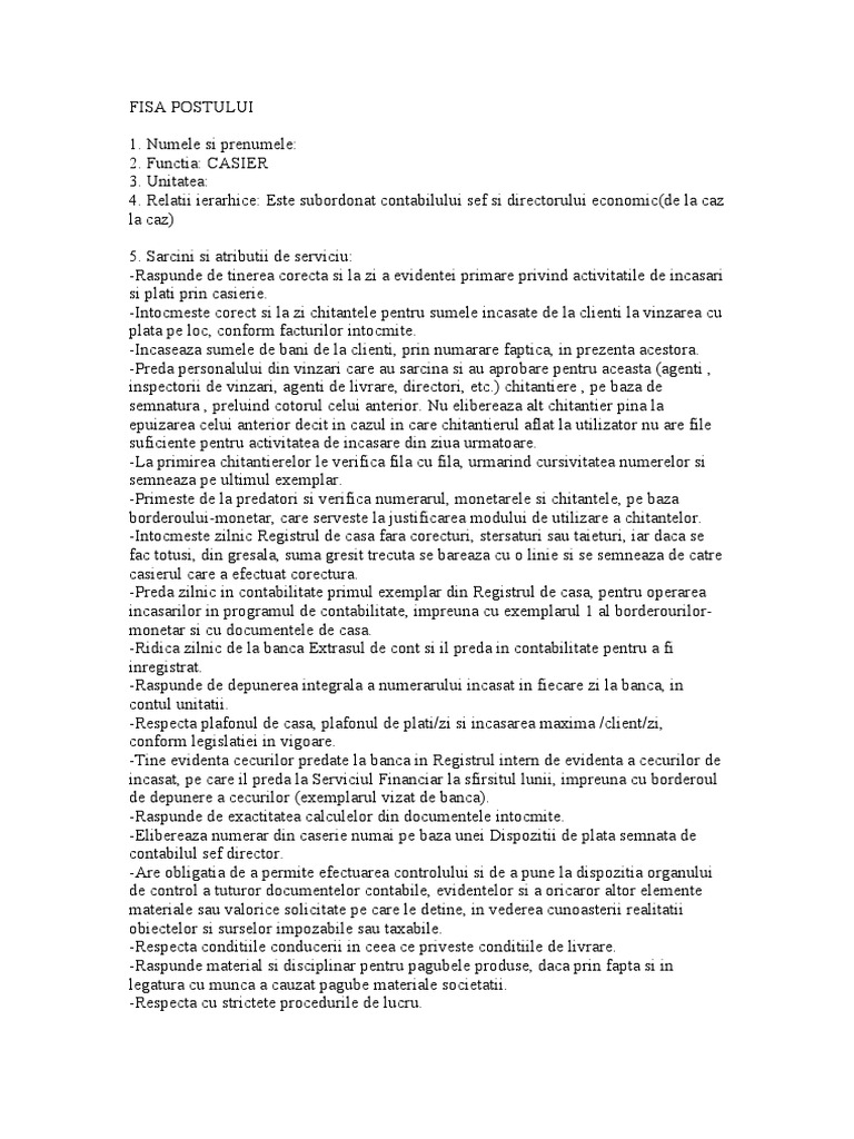 Nume si prenume salariat 4. Iata un model de fisa de post pentru un casier conform portalcodulmuncii ro. Fisa postului casier documente evaluare profesionala. Este subordonat sefului de magazin si directorului general postului studii.