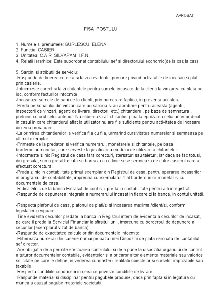 Fisa postului casier fisa evaluare profesionala personalizata raport evaluare calculator si documente cu explicatii. Numai daca este cazul 7. 2017 10696 iata un model de fisa de post pentru un casier conform portalcodulmuncii ro. Fisa evaluare riscuri casier.