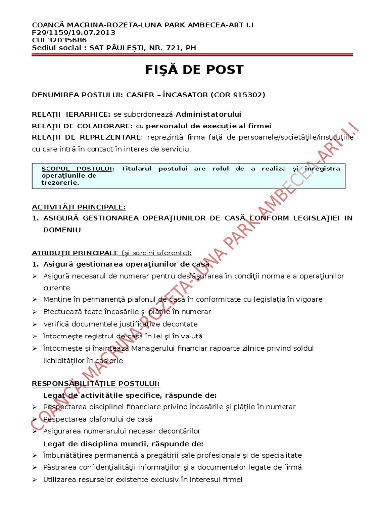 Nume si prenume sef ierarhic 6. 2019 1629 este demn de mentionat ca un casier incasator este cel responsabil sa incaseze banii pentru serviciile produsele oferite de firma clientilor. Numai daca este cazul 7. Acest site utilizează fişiere de tip cookie pentru a personaliza și îmbunătăți experiența utilizatorilor pe site ul nostru.
