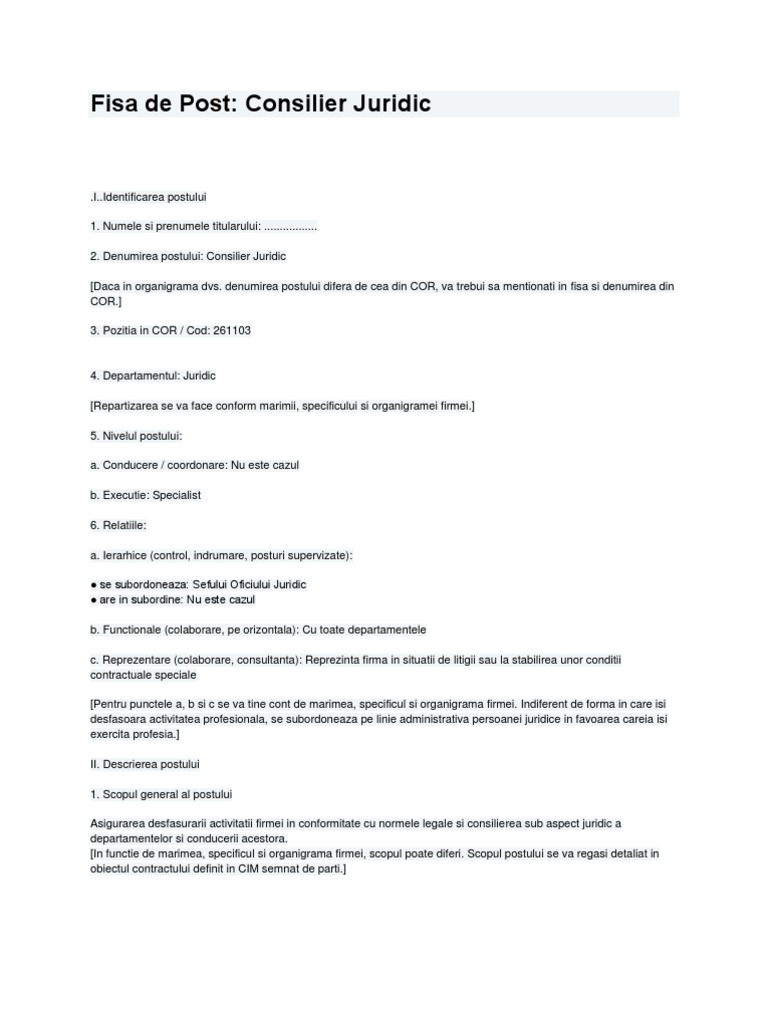 Fisa postului consilier juridic. Vezi aici raspunsul specialistilor. Nume si prenume sef ierarhic 6. Nume si prenume salariat 4. 35 pagini documente editabile.