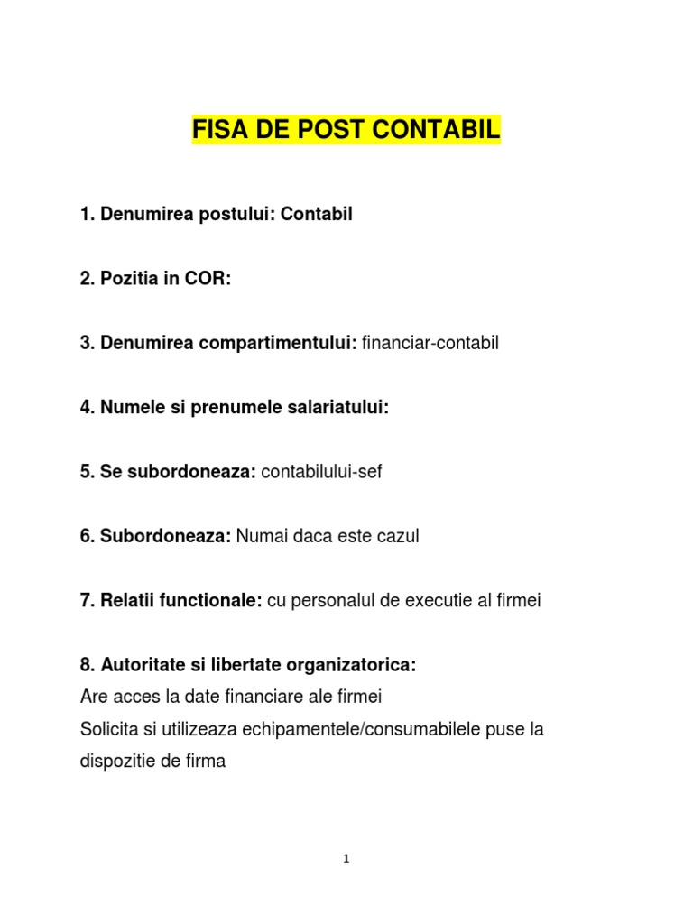 Fisa de post. Fisa de post contabil sef. în funcţie de mărimea specificul şi organigrama firmei scopul poate diferi. Contabilul este persoana care îşi desfăşoară activitatea în compartimentul financiar contabil al oricărei unităţi publice sau private şi acoperă parţial sau în totalitate activităţile acestuia.