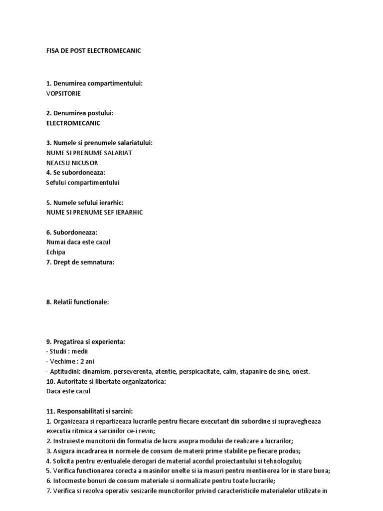 Lasă un răspuns anulează răspunsul. Electrician de întreţinere şi reparaţii. Pregătirea profesională impusă ocupantului postului. Nume si prenume salariat 4.