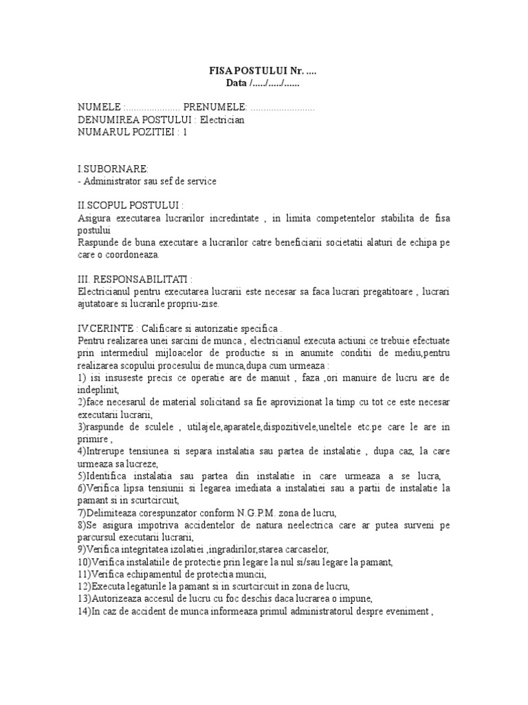 Fisa postului electrician. Nume şi prenume. 2 studii medii pentru a descarca aceasta fisa trebuie sa va autentificati. Fisa de post electrician in constructii fisa de post femeie de servici. Fisa de post electrician.