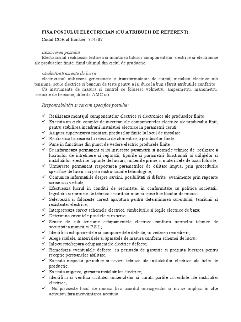 Fisa postului electrician echipamente electrice si energetice 1. 741305 electrician montare si reparatii echipament electric din centrale statii si posturi de transformare electrice subgrupa majora 74 grupa minora 741 grupa de baza 7413 nivelul de instruire. 311306 tehnician energetician electrician fisa postului fise de post fisa post regulament de ordine interioara. Realizarea obiectului contractului individual de muncă.