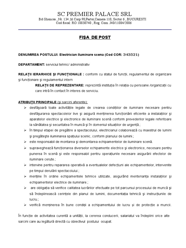 Certificat de calificare în meseria de electrician. Angajatorul trebuie sa elaboreze fisa postului pentru electrician pentru a fi exonerat de raspundere in caz de accident de munca prin natura acestei profesii in caz ca angajatul nu respecta normele de securitate si sanatate in munca sau disciplina la locul de munca conform atributiilor si raspunderilor ce i revin din sarcinile trasate sub. Studii şi sau calificări necesare. Fisa postului electrician echipamente electrice si energetice.