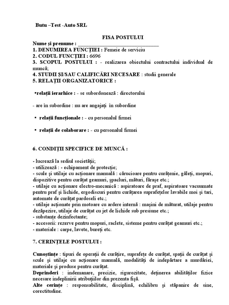 Este subordonat managerului general nu este cazul are relaţii de serviciu cu. Fisa postului femeie de serviciu model standard complex rubinian. Tipuri de operaşţii de curăţire suprafee de curţ ăţat spaţii de curăţat şi scule şi utilaje cu acţionare manuală modalităţi de îndepărtare a murdăriei. Numele si prenumele salariatului.