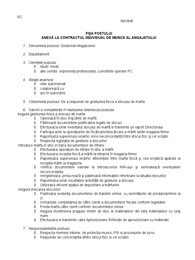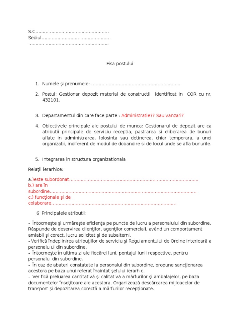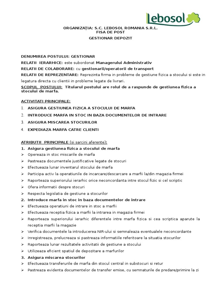 Fisa postului gestionar depozit relevant si pentru magaziner fisa evaluare profesionala personalizata raport evaluare calculator si documente cu explicatii. Fisa postului lucrator gestionar 2017 fisa de post lucrator gestionar 2017. Cat de utila va este aceasta informatie. Gestionar cod cor.