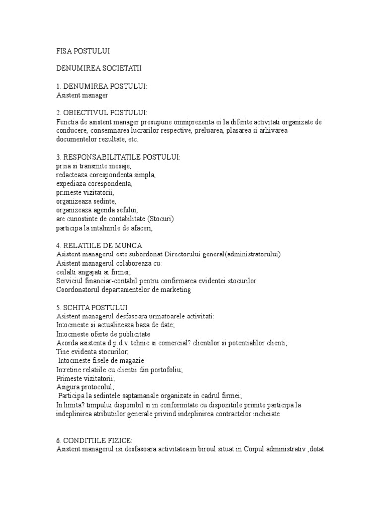 Atributii calificari competente model fisa postului pentru auditor energetic pentru cladiri ultimele articole. în particular acest rol poate însemna un întreg spectru de sarcini și responsabilități de la gestionarea resurselor și distribuirea sarcinilor la motivarea angajaților și soluționarea conflictelor leadership și îndeplinirea treburilor administrative. Iata un model de fisa de post pentru consultant in management potrivit portalcodulmuncii. Caracterul prioritar al demisiei fisa postului agent servicii client.