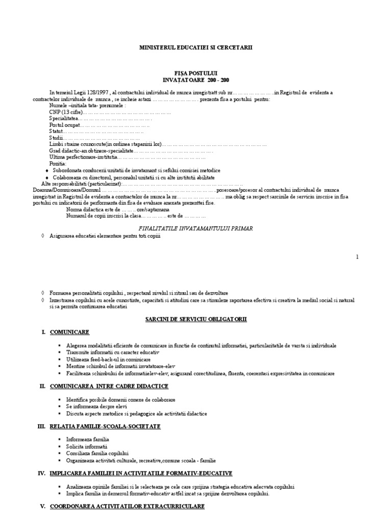 întocmeşte fişa postului pentru toţi membrii catedrei comisiei metodice. Model fisa de post invatator. Grupa majora 2 specialisti in diverse domenii de activitate subgrupa majora 23 specialisti in invatamant grupa minora 234 profesori in invatamantul primar si prescolar. Fisa de post invatator.