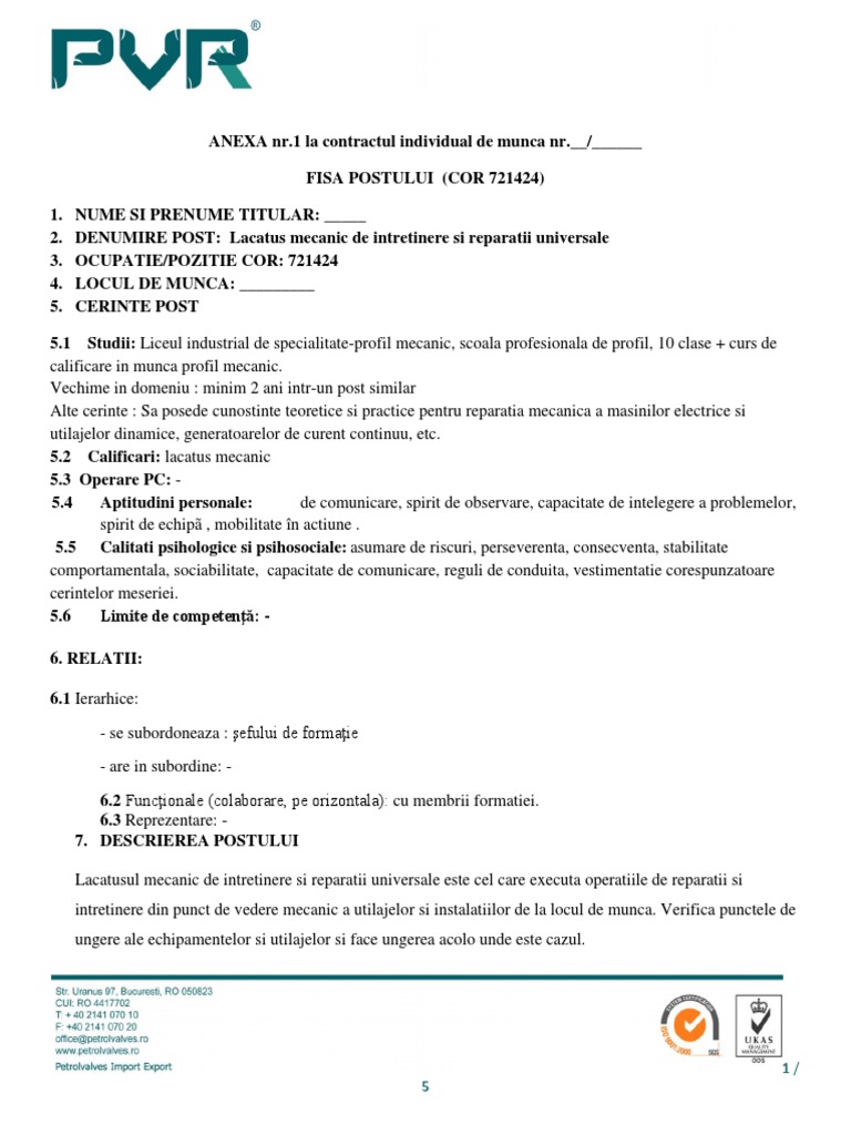 Mecanic macarale minim 1 an c. 721410 lacatus mecanic fisa postului fise de post fisa post regulament de ordine interioara. Fisa de post lacatus mecanic. Nume si prenume salariat 4.