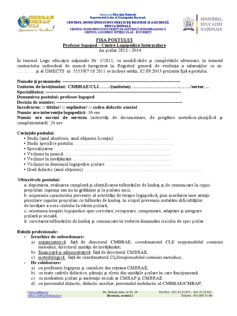 Fisa postului logoped. 262 din legea nr. 1 2011 şi art 10 1 2 din anexa 2 la omects 5555 07 10 2011 1 pe parcursul unui an şcolar un profesor logoped lucrează cu un efectiv de 15 40 copii elevi cu tulburări de limbaj. Fisa de post actor. Fisa postului pentru asistenta medicala medicina dentara.