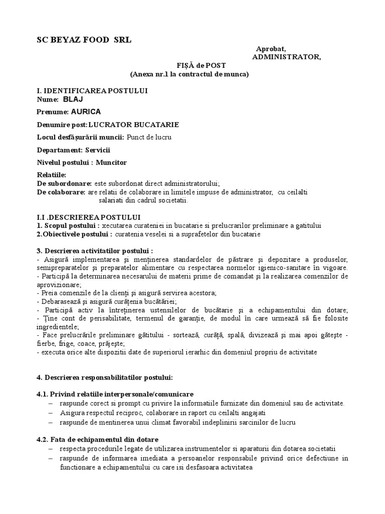 Descrierea postului rolul postului. Ajutor bucatar lucrator bucatarie minerva 92 srl. 941201 3 titular ii. Rog model de fisa postului lucrator in bucatarie nota.
