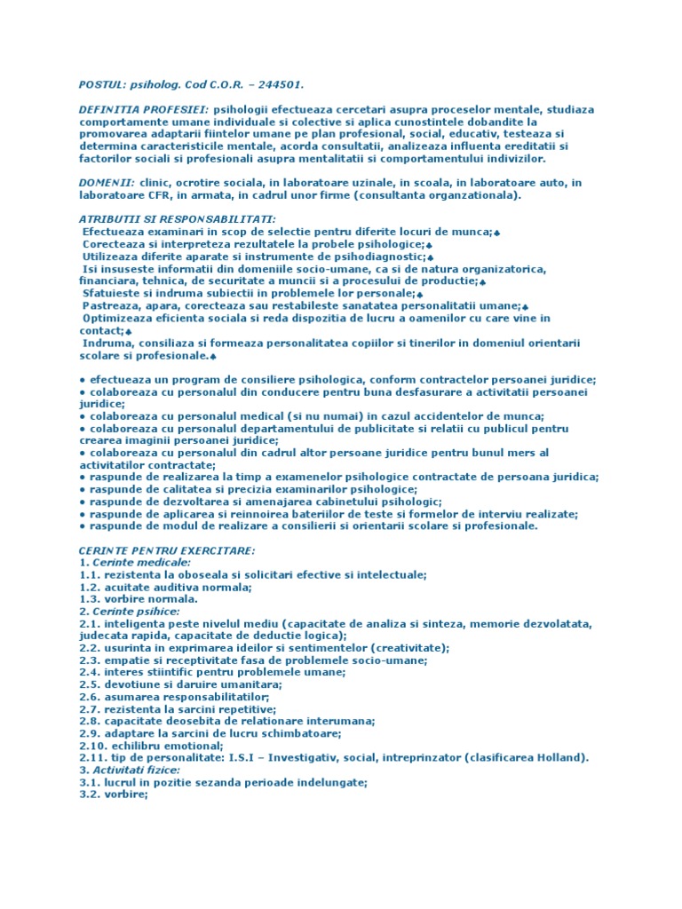 263414 psiholog scolar. Nume si prenume salariat 4. Model fisa postului pentru psiholog de cristian tanase 12 aug. Numele si prenumele titularului.