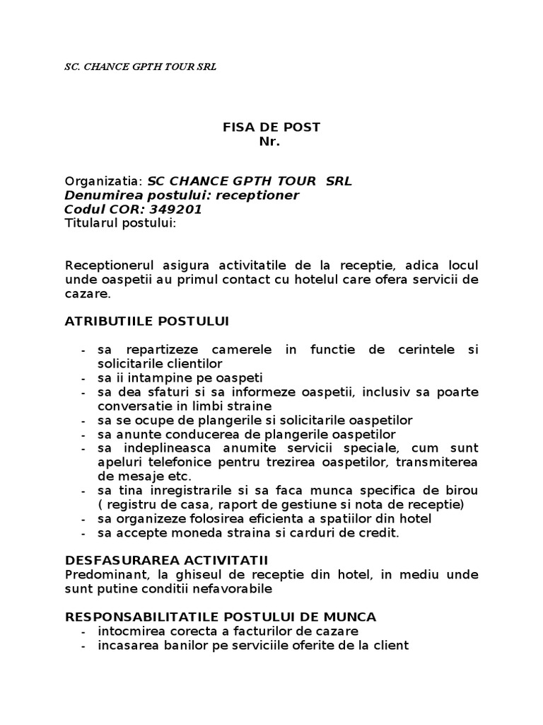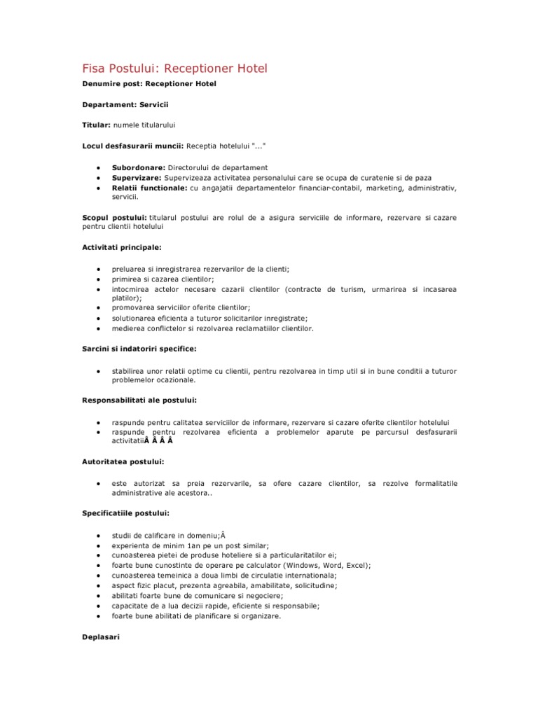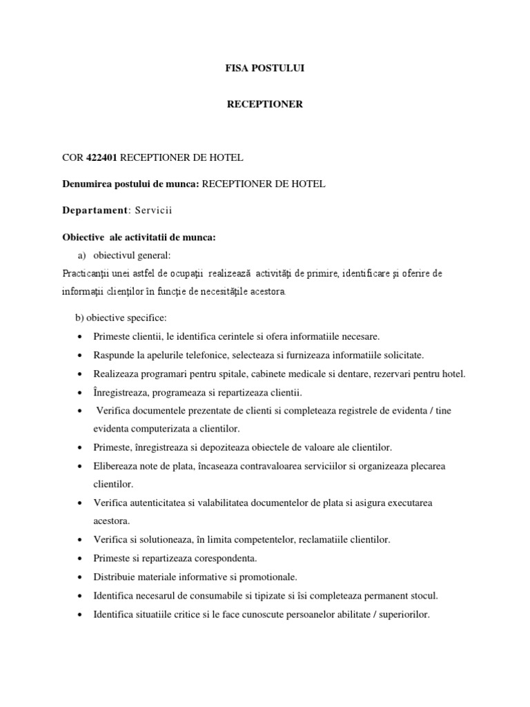 Fisa postului receptioner hotel turism etc model standard complex rubinian. Iata fisa de post pentru receptionist in 2019 conform portalcodulmuncii ro. Middle 2 5 ani adresa. Ne am actualizat politica de cookies pentru a integra în acestea si în activitatea noastră curentă cele mai recente modificări din regulamentul ue 2016 679 privind protecția persoanelor fizice în privința prelucrării datelor cu caracter personal și libera circulație a.