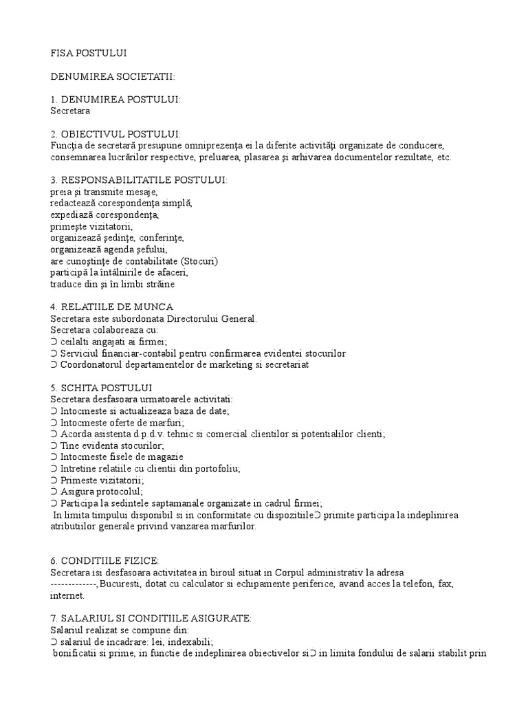 Fisa de post secretara. Criterii de evaluare a performantelor in toate fisele de post modelele rubinian au trecut cu succes prin sute de verificari itm. Numele si prenumele titularului. Denumirea postului difera de cea din cor va trebui sa mentionati in fisa si.