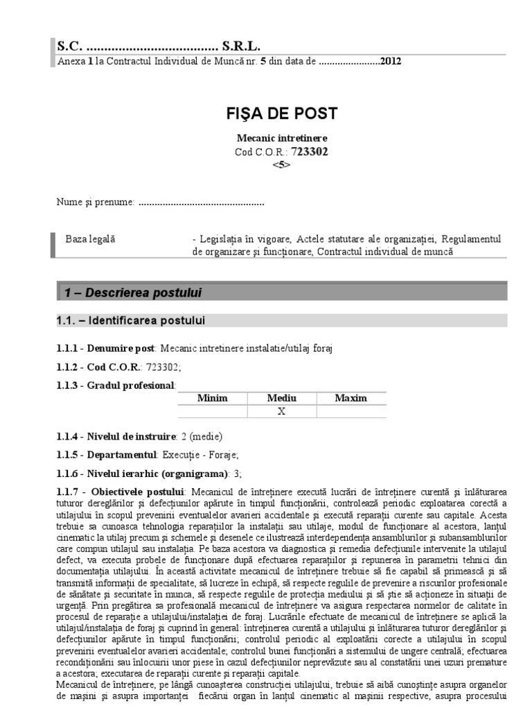 311519 tehnician mecanic fisa postului fise de post fisa post regulament de ordine interioara. 3 studii medii sau postliceale 311523. Tehnician electromecanic daca in organigrama denumirea postului difera de cea din cor va trebui sa mentionati in fisa si denumirea din cor. Fisa postului tehnician devize si masuratori in constructii relevant si pentru tehnician devizier si.