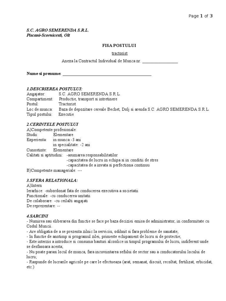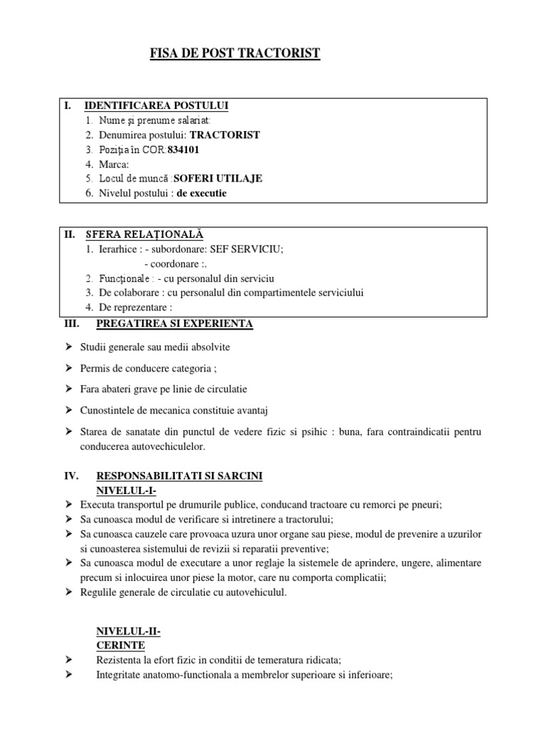 Fisa postului tractorist. Buna va rog mult sa ma ajutati cu un model de fisa postului pentru tractorist. Fisa de post tricoteza. Autoritate si libertate organizatorica. Grupa majora 8 operatori la instalatii si masini asamblori de masini si echipamente.