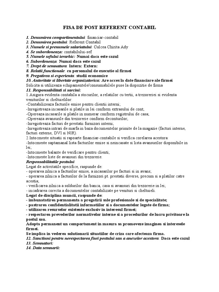Mulțumesc ampe joi 15 februarie 2018 10 35 vezi mesaj in discutie. Fisa de post contabil. în funcţie de mărimea specificul şi organigrama firmei scopul poate diferi. Contabil daca in organigrama denumirea.