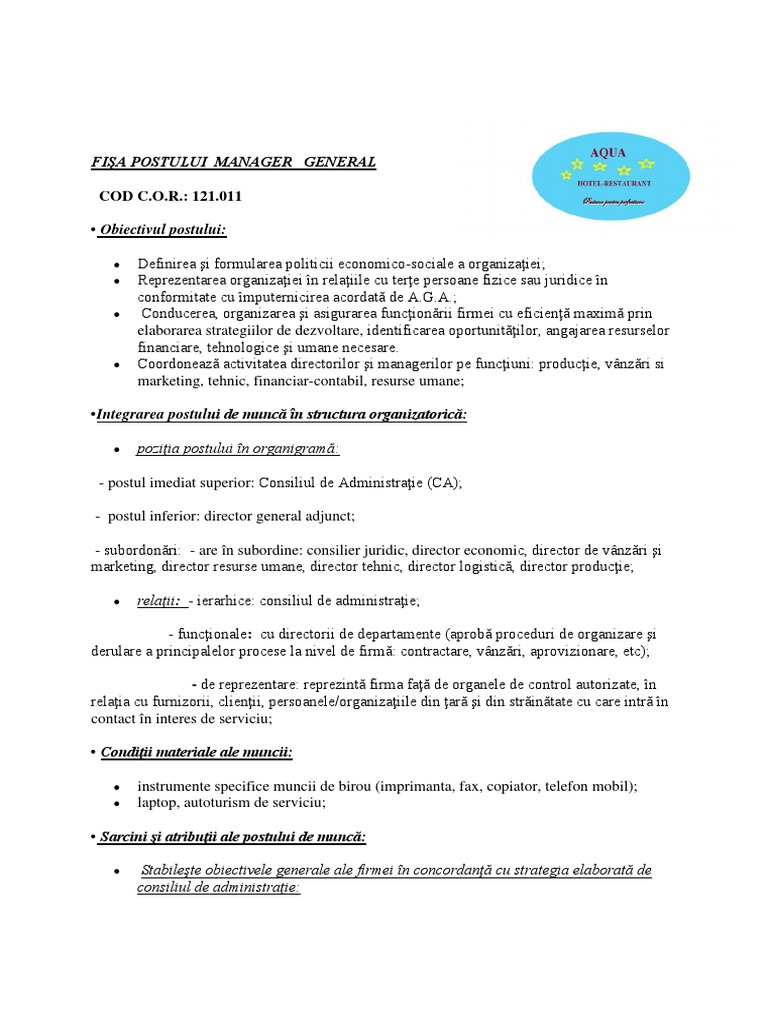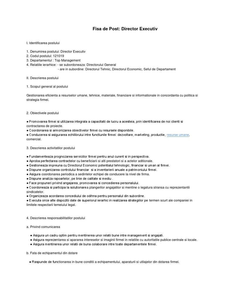 A unui climat favorabil indeplinirii sarcinilor de lucru. Scopul postului se va regasi detaliat in obiectul contractului definit in cim semnat de parti. Fișa de post manager general model fișa de post gratuit editabil conținut orientativ. Referat privind savarsirea unei abateri disciplinare fisa postului descrierea postului si specificarea postului model de regulament intern modificat conform codului muncii 2011 concediul salariatului.
