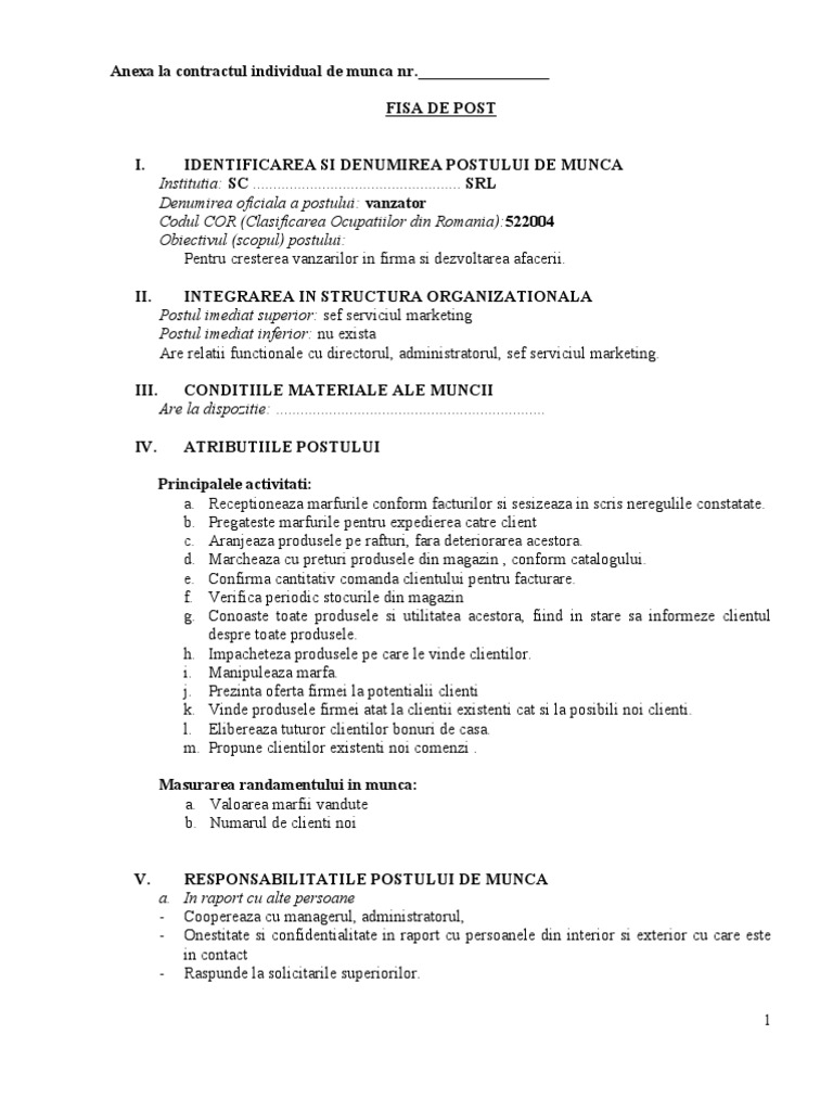 Fisa postului vanzator. Fisa de post vanzator. Alături de studii acestea contribuie la pregătirea pentru sarcinile şi activităţile postului. Articol publicat in resurse umane contractul de munca avand ca subiect fise de post citeste mai multe despre fise de post gratuite modele fise de post fisa postului model doc fisa postului model pdf fisa postului lucrator comercial editabila fisa postului lucrator comercial completata fisa postului lucrator comercial doc fisa postului. Nume si prenume salariat 4.
