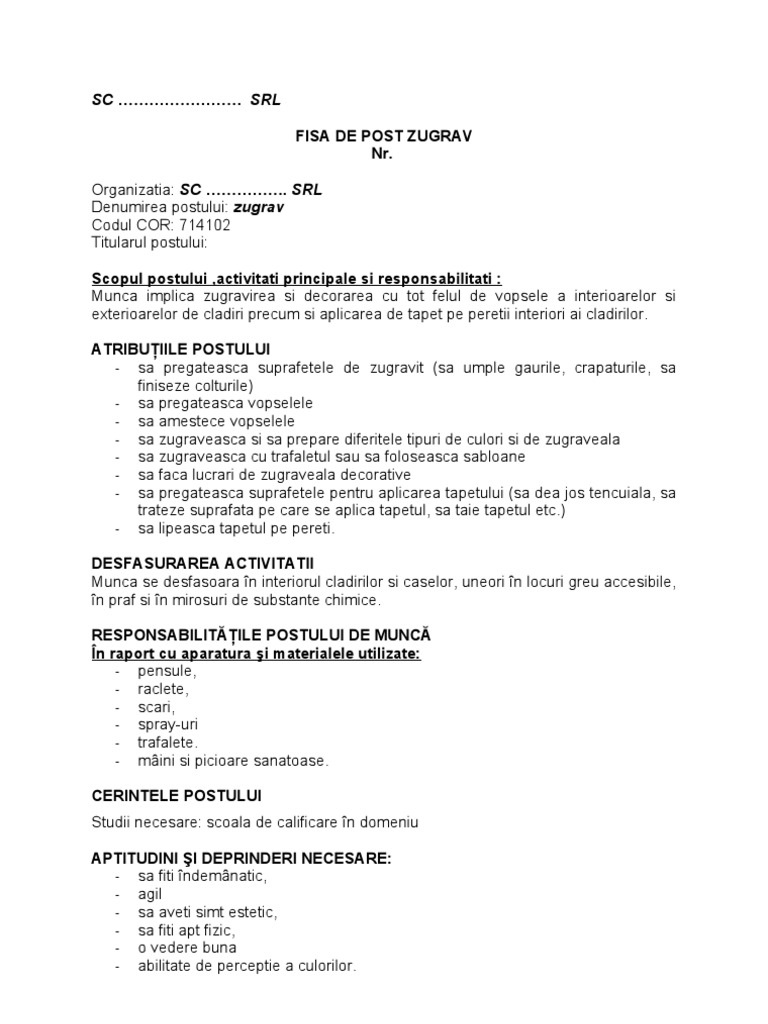 Fisa postului zugrav. Numele si prenumele salariatului. Data ultimei actualizari sau verificari. Criterii de evaluare a performantelor in toate fisele de post modelele rubinian au trecut cu succes prin sute de verificari itm. Fisa de post zugrav.
