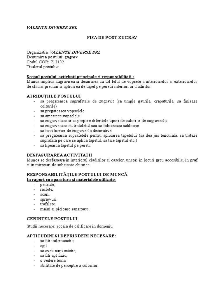 Acest site foloseste cookie uri conform noului regulament de protectie a datelor gdpr pentru a va asigura cea mai buna experienta online. Fisa postului zugrav vopsitor ipsosar tapetar. 23 pagini document editabil 6 mai 2020. Numele si prenumele titularului.